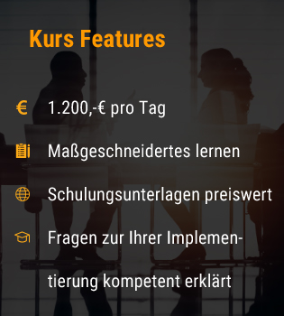 Unsere Inhouse-Schulungen verlaufen ähnlich wie unsere anderen Kurse. Allerdings wird eine Inhouse-Schulung speziell auf Ihr Unternehmen zugeschnitten. Sie haben Fragen zur Umsetzung der Inhalte in Ihrem Unternehmen? Kein Problem! In einer Inhouse-Schulung kann unser Trainer speziell auf Sie und Ihre Fragen eingehen.